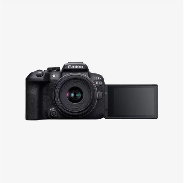 Camera foto Canon Mirrorless EOS R10 kit + obiectiv RF-S 18-45mm F4.5- 6.3 IS STM , Black, sensor APS-C 24.2 MP,rezolutie sensor imagine: CMOS, 22,3 x 14,8 mm, Raport de aspect: 3:2, sistem curatare integrat, Procesor imagine Digic X, Montură obiectiv: RF, Distanţă focală: 1.6 X, Focalizare: Dual Pixel CMOS AF II, Puncte focalizare: Cu zonă 100 % pe orizontală şi 100 % pe verticală (selectare automată) 90 % pe orizontală şi 100 % pe verticală (selectare manuală), Sensibilitate ISO: Auto 100 – 32000, se poate extinde la H:51200, vizor electronic OLED 0.39″, 2.36mil puncte, 1024 x 768, LCD 2.95″ 1.04 mil puncte, tactil, filmare MP4: 4K UHD, Full HD (16:9), 4K / Full HD: H.265 / HEVC, audio: AAC / PCM linear, 4K / Full HD: H.264 / MPEG-4 AVC, audio: AAC / PCM liniar, Rafala 15 CPS, WIFI, Bluetooth, Interfata: USB C SuperSpeed USB 3.2 Gen 2, mini HDMI, Stocare: SD/SDHC/SDXC şi UHS-II, Baterie Li-ion reîncărcabilă LP-E17 (inclusă), Cu LCD aprox. 430 de fotografii (la 23 °C), Cu vizor aprox. 260 de fotografii (la 23 °C), Încărcător de baterii LC-E17E (inclus).