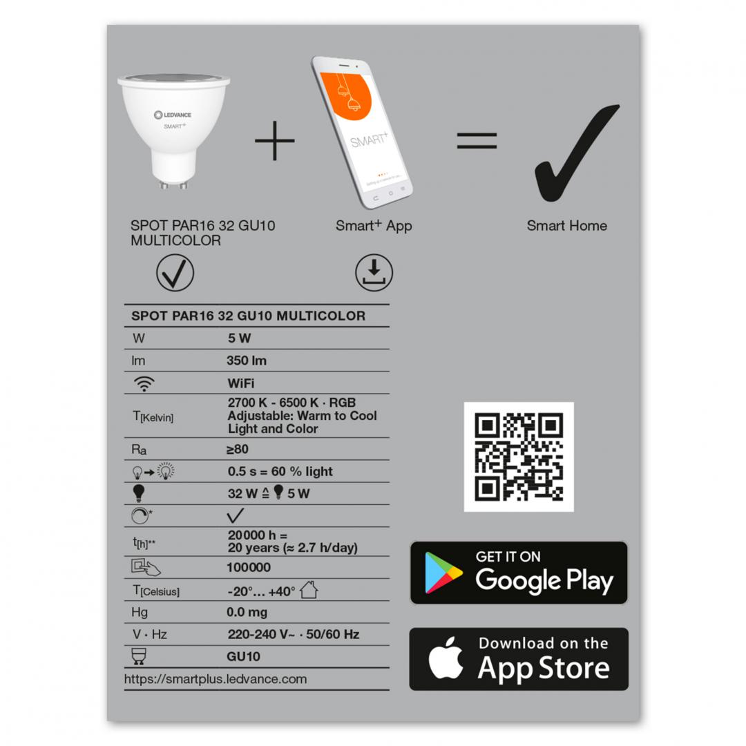 Bec LED RGB inteligent Ledvance SMART+ WiFi SPOT Multicolour, GU10, 4.9W (50W), 350 lm, lumina alba si color (2700-6500K)