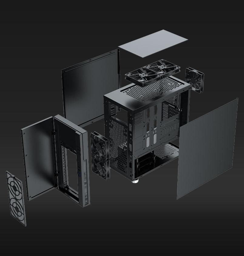 • Supported fans: 5 pieces – Rear 1x 120 mm, Front 2x 120 mm, Top 2x 120/140 mm