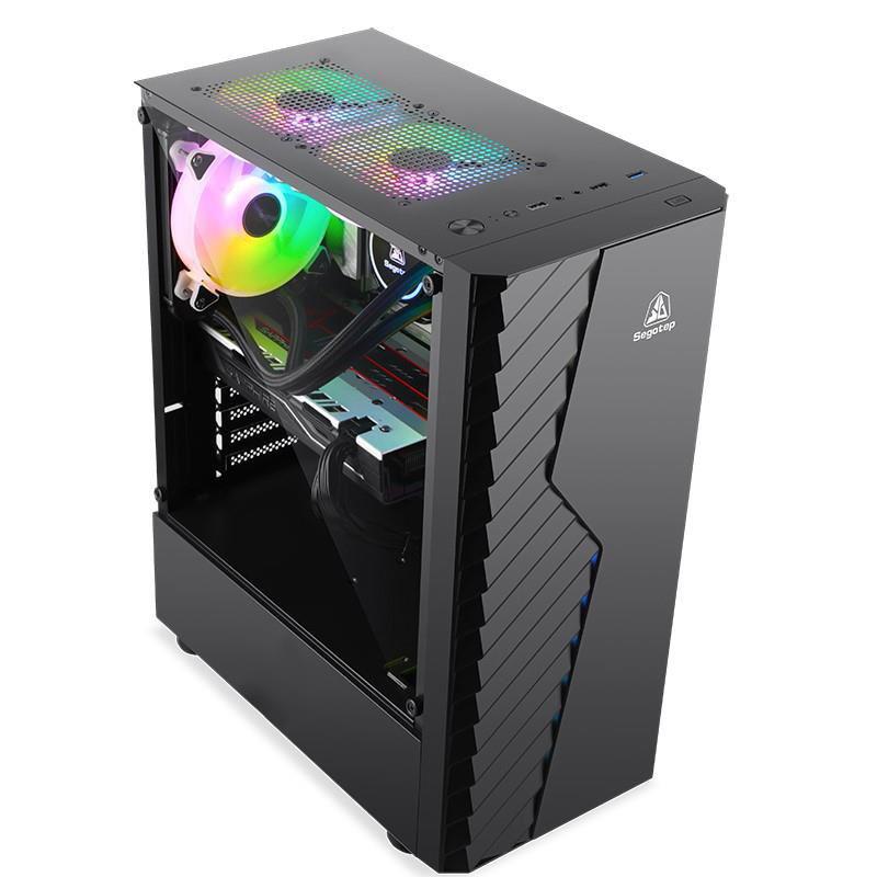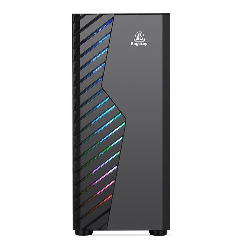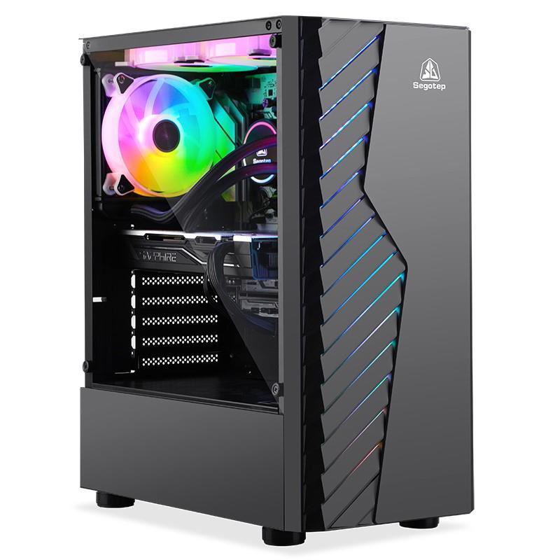 Carcasa Segotep Nova V1 neagra, SPCC Steel ATX Mid Tower, fara sursa (tip ATX, montata jos), interior vopsit negru, 2x 3.5”/2.5”(intern), 1x 3.5” (intern, se moteaza pe power cover), 2×2.5” (intern), design tool-less, fata – 3x 120mm aRGB LED fan (inclus) sau2x 140mm fan (optional), spate – 1x 120mm fan (optional, pozitie ajustabila), tavan – 2x 120mm fan (optional), design premium cupanou lateral din plexiglass, include controller si telecomanda, 1x USB 3.0, 2x USB 2.0, HD Audio, ATX / microATX / Mini-ITX,sloturi expansiune: x7, inaltime maxima cooler procesor: 160mm, lungime maxima placa video: 270mm cu radiator montat sau 300mm fararadiator montat in partea frontala, dimensiuni: 366 x 200 x 456mm