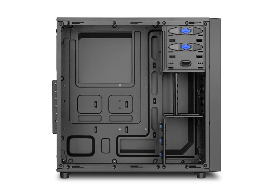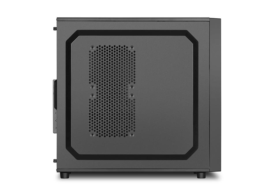 Carcasa Sharkoon VS4-V, ATX, fara sursa, 2x USB 3.0, 1x 3.5mm jack, vent. incluse: fata 1x 12cm fan (pre-installed), vent. opt.: fata 1x 12cm, lateral 2x 12cm, spate 1x 12cm, 2x 5.25″, 3x 3.5″, 4x 2.5″, Greutate: 4.5 kg, Dimensiuni: 44.5 x 20.0 x 43.0 cm, Neagra