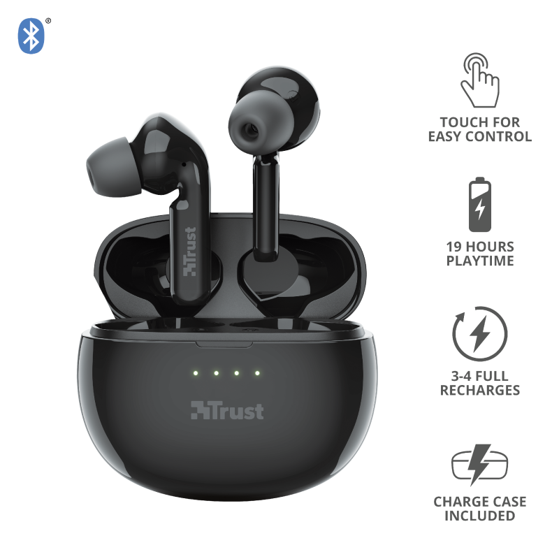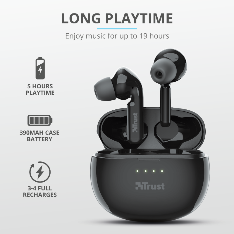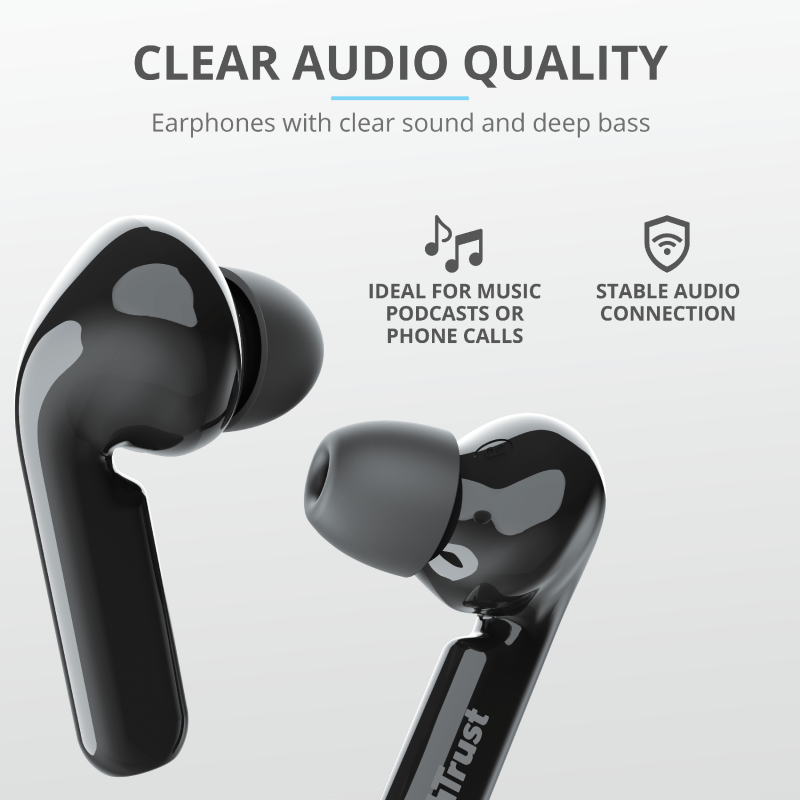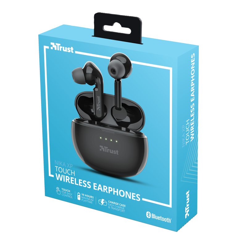 Casti cu microfon Trust Nika Compact Bluetooth Earphones Specifications General Height of main product (in mm) 58 mm Width of main product (in mm) 52 mm Depth of main product (in mm) 25 mm Total weight 46 g Weight of main unit 4 g Connectivity Connection type wireless Connector style straight Cable style normal Bluetooth yes Wireless range 10 m Wireless protocols Bluetooth Bluetooth version 5.0 Cables included micro-USB charge cable Connector type micro-USB Audio Sound reproduction Stereo Audio channels 2.0 Driver units 2 Microphone yes Detachable microphone no True Wireless Stereo (TWS) yes Bluetooth profiles A2DP, AVRCP, HFP Audio codecs SBC Frequency response 20 Hz – 20000 Hz Features NFC no Background noise reduction no Foldable no Software no Accessories charging case, micro-USB charge cable, ear tip sizes S/M/L Noise reduction no Headphone Adjustable headband no Active Noise Cancelling no Earcup type in-ear Ear-cap construction closed-back Swivel earcups no Rotating earcups no Output channels 2 Magnet type Neodymium Microphone Sensor type microphone dynamic Pick-up pattern Omnidirectional Echo cancellation yes Gaming Designed for gaming no Lighting Lights no Protection Waterproof no IP Code (International Protection Rating) no Power Recharge time 2 hours Playing time 5 hours Rechargeable battery yes Max battery life – phone calls 3 hours Max battery life – music 5 hours Battery type (AA, AAA, etc.) polymer Battery composition (Alkaline, Li-ion, etc.) Lithium-ion polymer Input Power source USB Compatibility Suitable for Air travel, Calling, Daily use, Handsfree calling, Listening to music, Home Compatible Software Platforms Android, Chrome OS, iOS, Linux, Mac OS, Windows Compatible Device Types Bluetooth devices General compatibility Bluetooth audio devices Control Controls on earcap yes Controls forward, backward, on/off, pause, play, voice assistant Remote control on earcap LED indicator functions Pairing, charging LED indicators yes https://www.trust.com/en/product/23839-nika-touch-xp-bluetooth-earphones