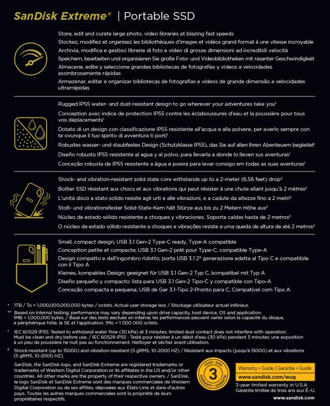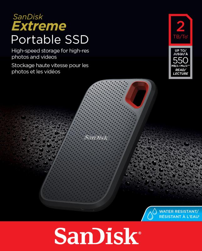 SSD extern SanDisk, Extreme Portable, 2TB, 2.5″, USB 3.1, Read speed: up to 550MB/s, Rezistente la apa, praf si socuri