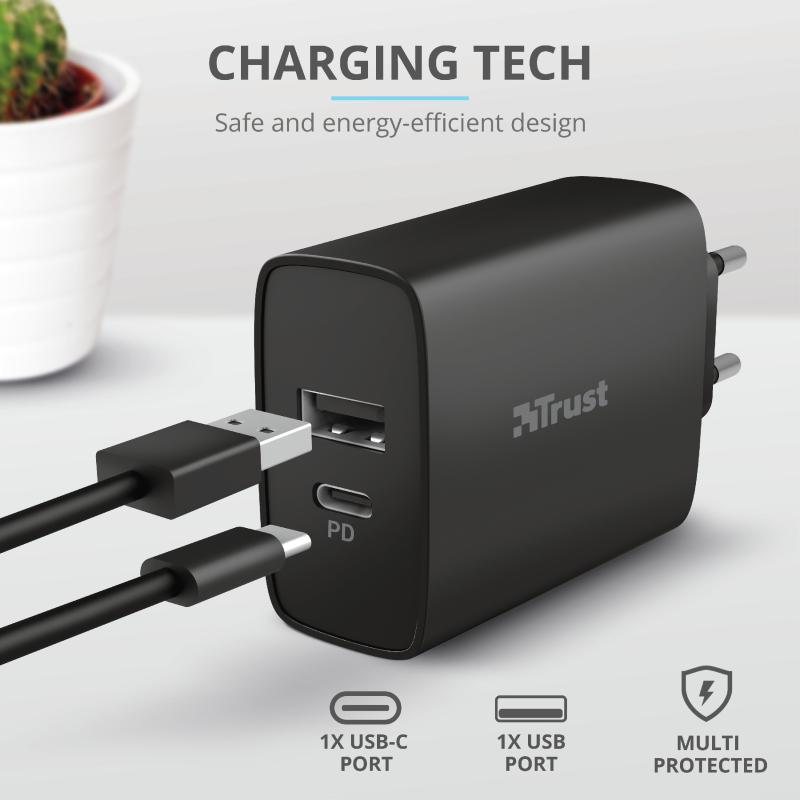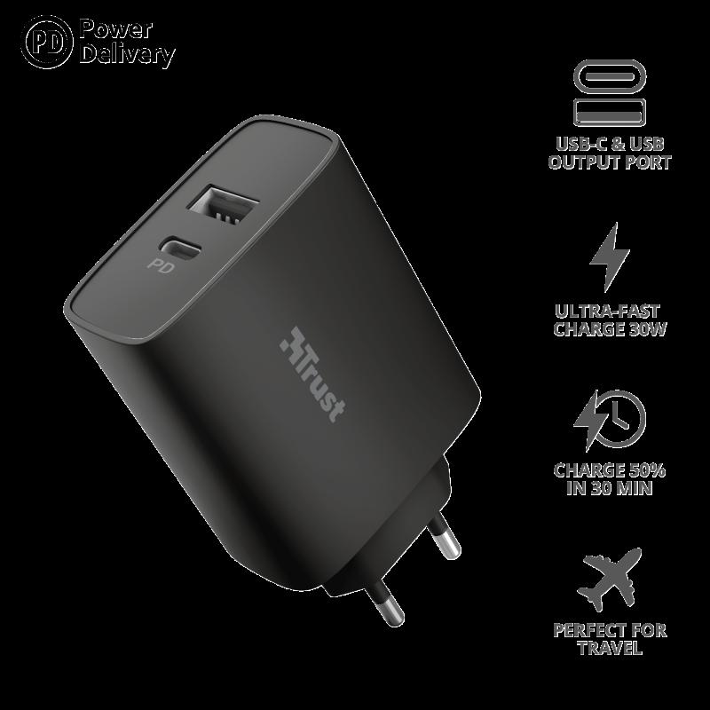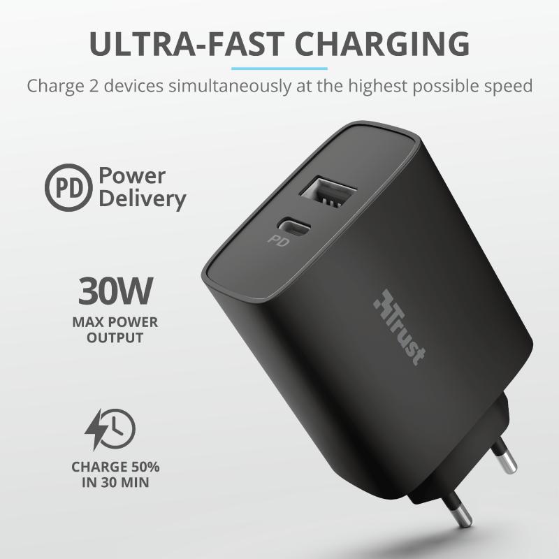 Incarcator rapid pentru perete QMAX USB C+A WALL CHARGER PD 30W Specifications General Number of USB ports 3 Height of main product (in mm) 95 mm Width of main product (in mm) 50 mm Depth of main product (in mm) 27 mm Total weight 93 g Weight of main unit 93 g Protection Protections over-load, short-circuit, over-heat Input Power plug type EU Power source wall socket Output USB port A types 1 Charging technology auto-detect, USB PD 3.0 Output specification – Port 1 2.4A/12W, auto-detect Output specification – Port 2 18W, PD, USB-C USB port C types 1 Total output power (max): A, W 30W Compatibility Compatible Device Types smartphone, tablet, accessories, laptop
