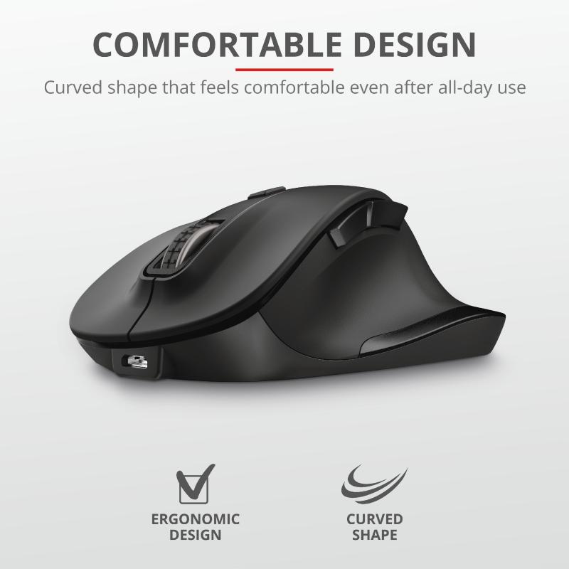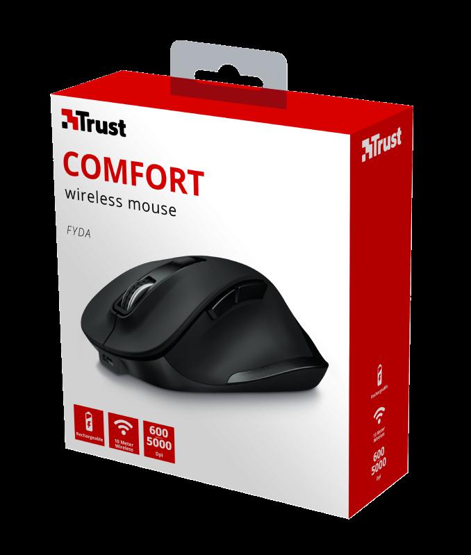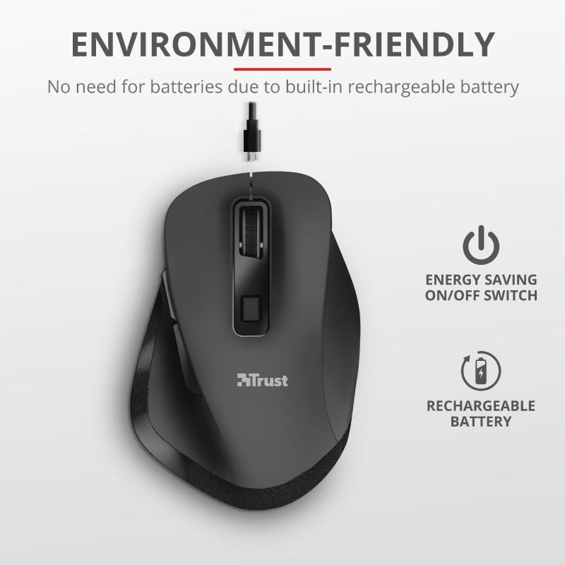 Mouse fara fir Trust Fyda Rechargeable Wireless Comfort Mouse Specifications General Height of main product (in mm) 120 mm Width of main product (in mm) 43 mm Depth of main product (in mm) 81 mm Total weight 108 g Weight of main unit 106 g Formfactor standard Ergonomic design yes Connectivity Connection type wireless Bluetooth no Wireless range 10 m Wireless protocols RF 2.4GHz USB receiver included yes USB version 2.0 Connector type USB Features Silent click no Gliding pads UPE Software no USB receiver storable yes DPI adjustable yes Power saving yes Gaming Designed for gaming no Lighting Lights no Power Rechargeable battery yes Input Power source micro-USB Sensor DPI 800, 1200, 1600, 2000, 2400 DPI range 800 dpi – 2400 dpi Max. DPI 2400 dpi Sensor technology optical Compatibility Compatible Software Platforms Windows, Mac OS, Chrome OS Compatible Device Types laptop, pc Control Grip type palm Horizontal scrolling no Controls forward, backward, dpi loop, on/off, left, right, mid Number of buttons 6 DPI button yes On/off button yes Programmable buttons no Adjustable weight no Suitable surface carpet/laminate/parket/resin floors/floor tiles Indicators Battery empty, DPI Left-right handed use right-handed Scroll wheel yes Trackball no https://www.trust.com/en/product/23804-fyda-rechargeable-wireless- comfort-mouse