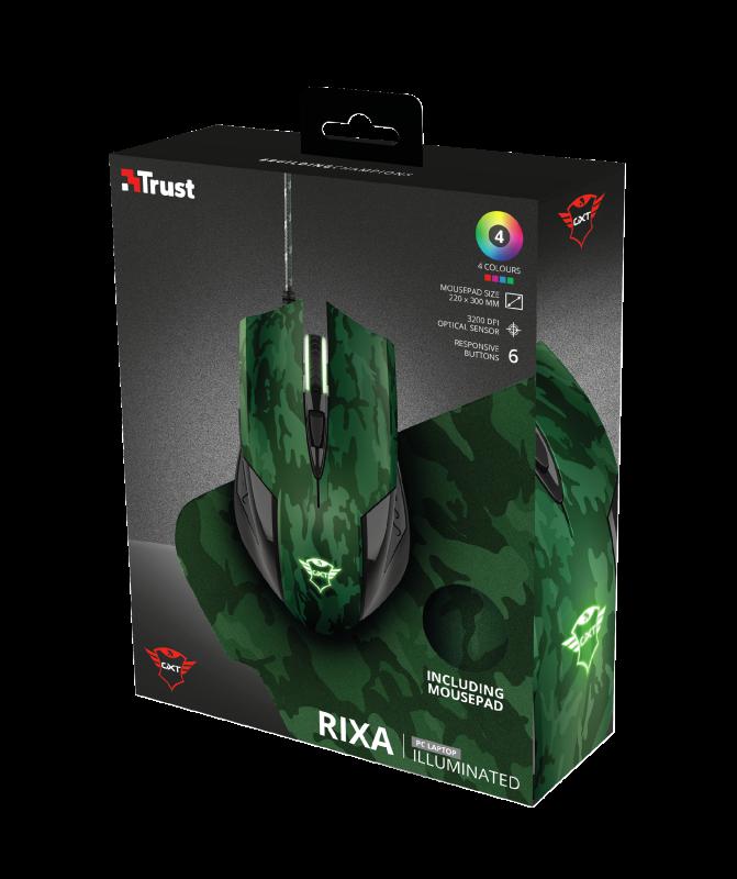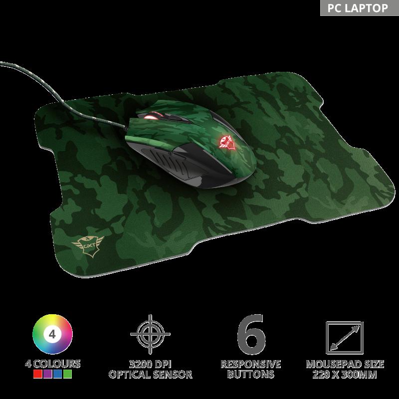 Mouse cu fir Trust GXT 781 Rixa Camo Gaming Mouse & Mouse Pad Specifications General Height of main product (in mm) 40 mm Width of main product (in mm) 75 mm Depth of main product (in mm) 125 mm Total weight 124 g Weight of main unit 84 g Compatibility Compatible Device Types laptop, pc Compatible Consoles no Compatible Software Platforms Windows