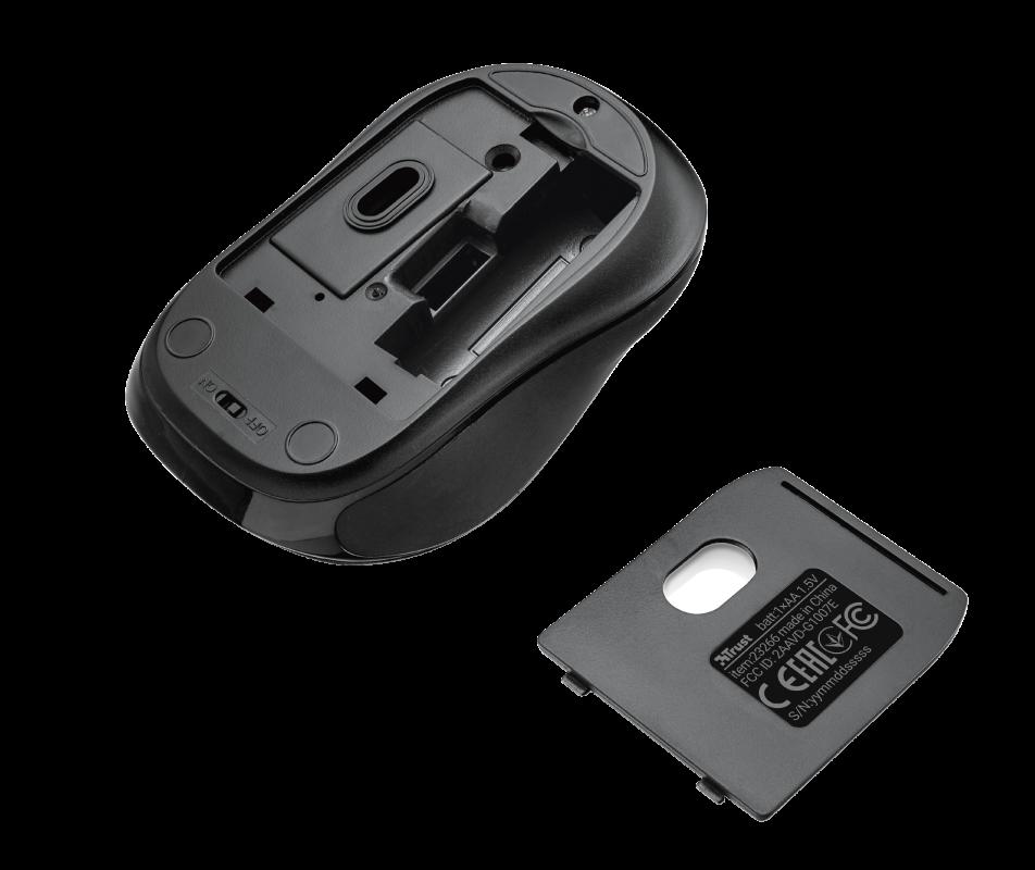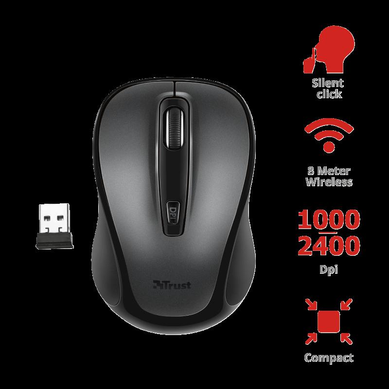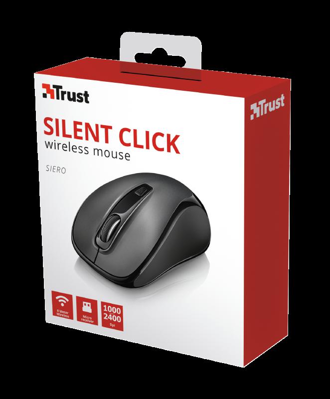 Mouse fara fir Trust Siero Silent Click Wireless Mouse Specifications General Height of main product (in mm) 38 mm Width of main product (in mm) 57 mm Depth of main product (in mm) 96 mm Total weight 85 g Formfactor standard Ergonomic design no Connectivity Connection type wireless Bluetooth no Wireless protocols RF 2.4GHz Wireless range 8 m Receiver included yes USB version 2.0 Connector type USB Features Silent click yes Software no USB receiver storable yes DPI adjustable yes Power saving yes Gaming Designed for gaming no Lighting Lights no Power Batteries included yes Battery life (months) 6 month Rechargeable battery no Number of batteries 1 Wireless transmission power (mW) 1 mW Battery type (AA, AAA, etc.) AA Input Power source battery Sensor DPI 1000, 1600, 2400 Max. DPI 2400 dpi Sensor technology optical Compatibility Compatible Device Types pc, laptop Compatible Software Platforms Mac OS, Windows, Chrome OS Control Grip type palm Horizontal scrolling no Controls dpi, on/off, left, right Number of buttons 4 DPI button yes On/off button yes Programmable buttons no Adjustable weight no Suitable surface non-reflective flat surface Left-right handed use right-handed, left-handed Scroll wheel yes Trackball no