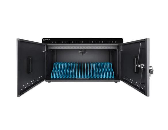 Statie de incarcare Manhattan 715959 pentru tablete si telefoane cu display de pana la 10″, suporta pana la 20 dispozitive, tip port USB-C PD, putere totala 360W, 18W per port, cu protectie la supratensiune, ventilatie silentioasa, carcasa de metal, negru. Nu contine cablul de alimentare si alte cabluri conexe.
