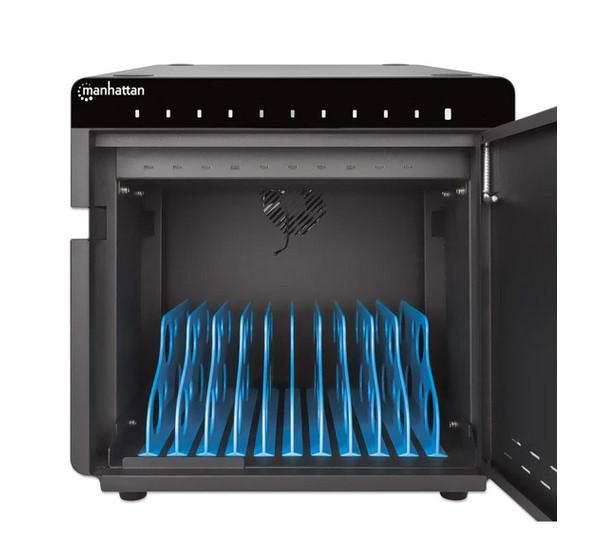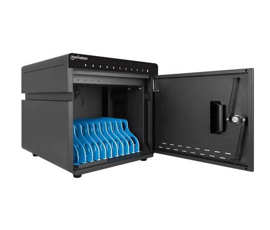 Statie de incarcare Manhattan 715942 pentru tablete si telefoane cu display de pana la 10″, suporta pana la 10 dispozitive, tip port USB-C PD, putere totala 180, 18W per port, cu protectie la supratensiune, ventilatie silentioasa, carcasa de metal, negru. Nu contine cablul de alimentare si alte cabluri conexe.