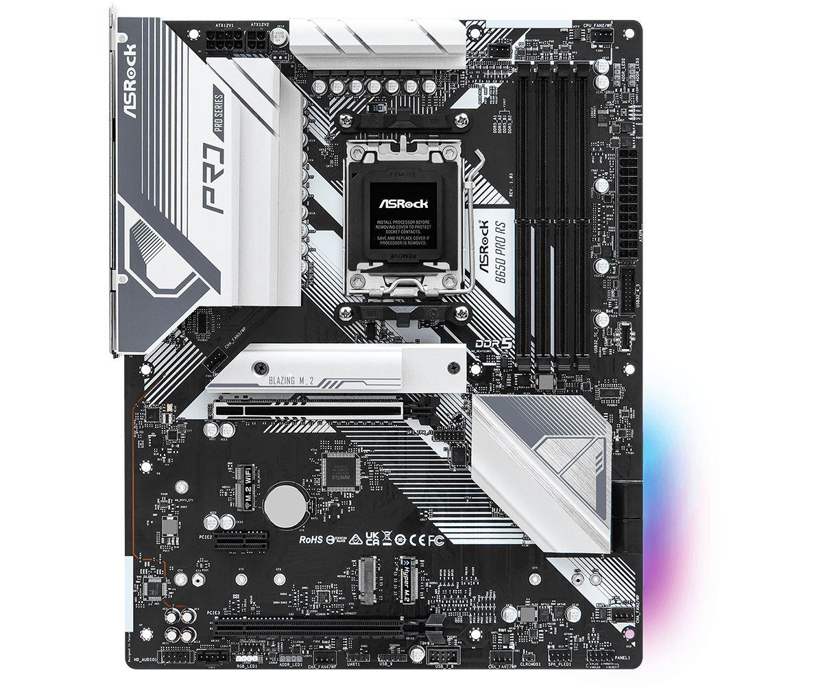 Placa de baza AsRock B650 PRO RS AM5 Supports AMD Ryzen™ 7000 Series Processors 14+2+1 Phase Power Design, SPS 4 x DDR5 DIMMs, supports up to 6200+(OC) 1 PCIe 4.0 x16, 1 PCIe 3.0 x16, 1 PCIe 4.0 x1, 1 M.2 Key-E for WiFi Graphics Output Options: 1 HDMI, 1 DisplayPort 7.1 CH HD Audio (Realtek ALC897 Audio Codec), Nahimic Audio 1 Blazing M.2 (PCIe Gen5x4), 1 Hyper M.2 (PCIe Gen4x4), 1 M.2 (PCIe Gen3x2 & SATA3), 4 SATA3 1 USB 3.2 Gen2x2 Type-C (Front), 1 USB 3.2 Gen2 Type-C (Rear), 1 USB 3.2 Gen2 Type-A (Rear), 4 USB 3.2 Gen1 (2 Rear, 2 Front), 9 USB 2.0 (6 Rear, 3 Front) Realtek 2.5G LAN