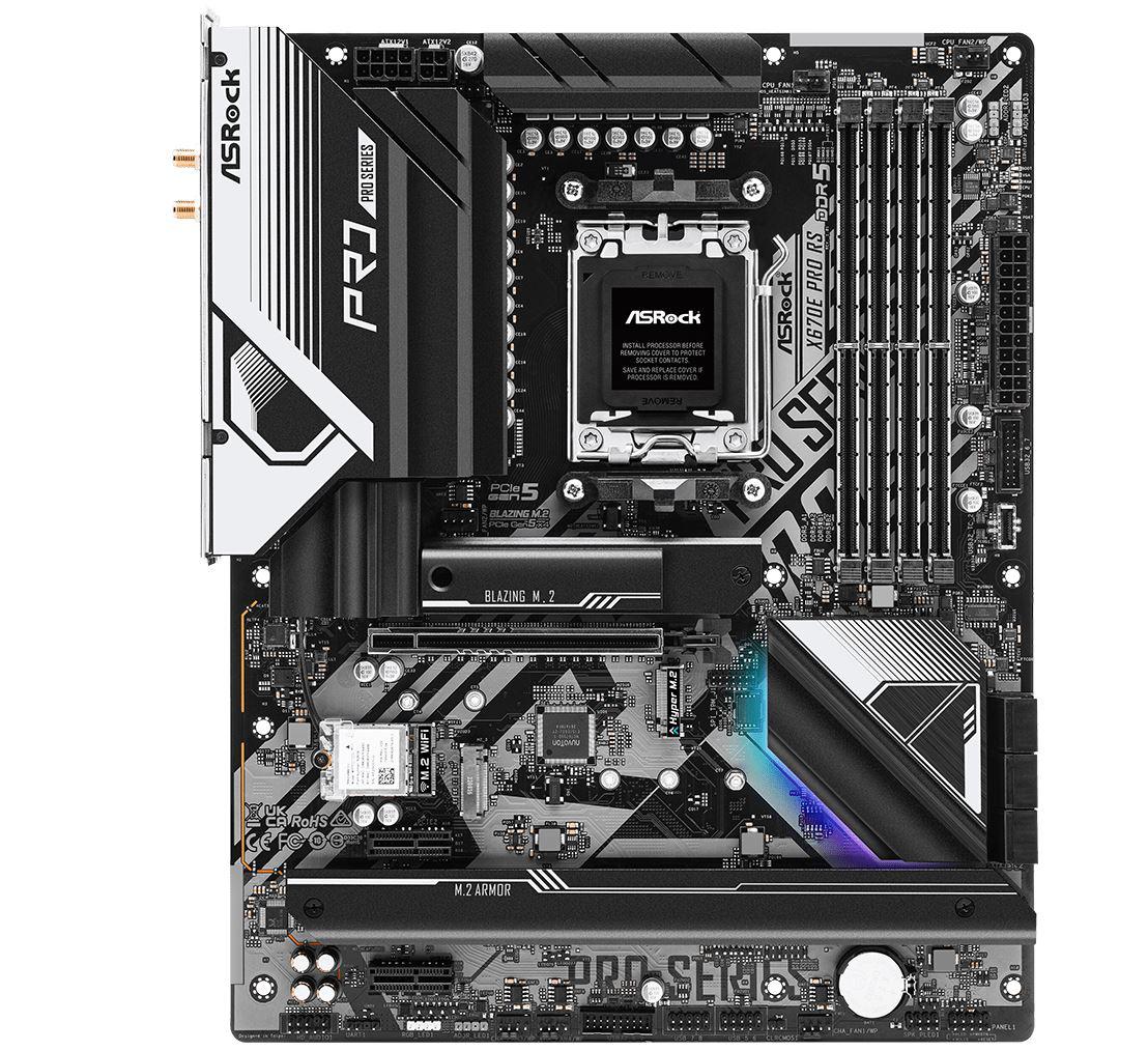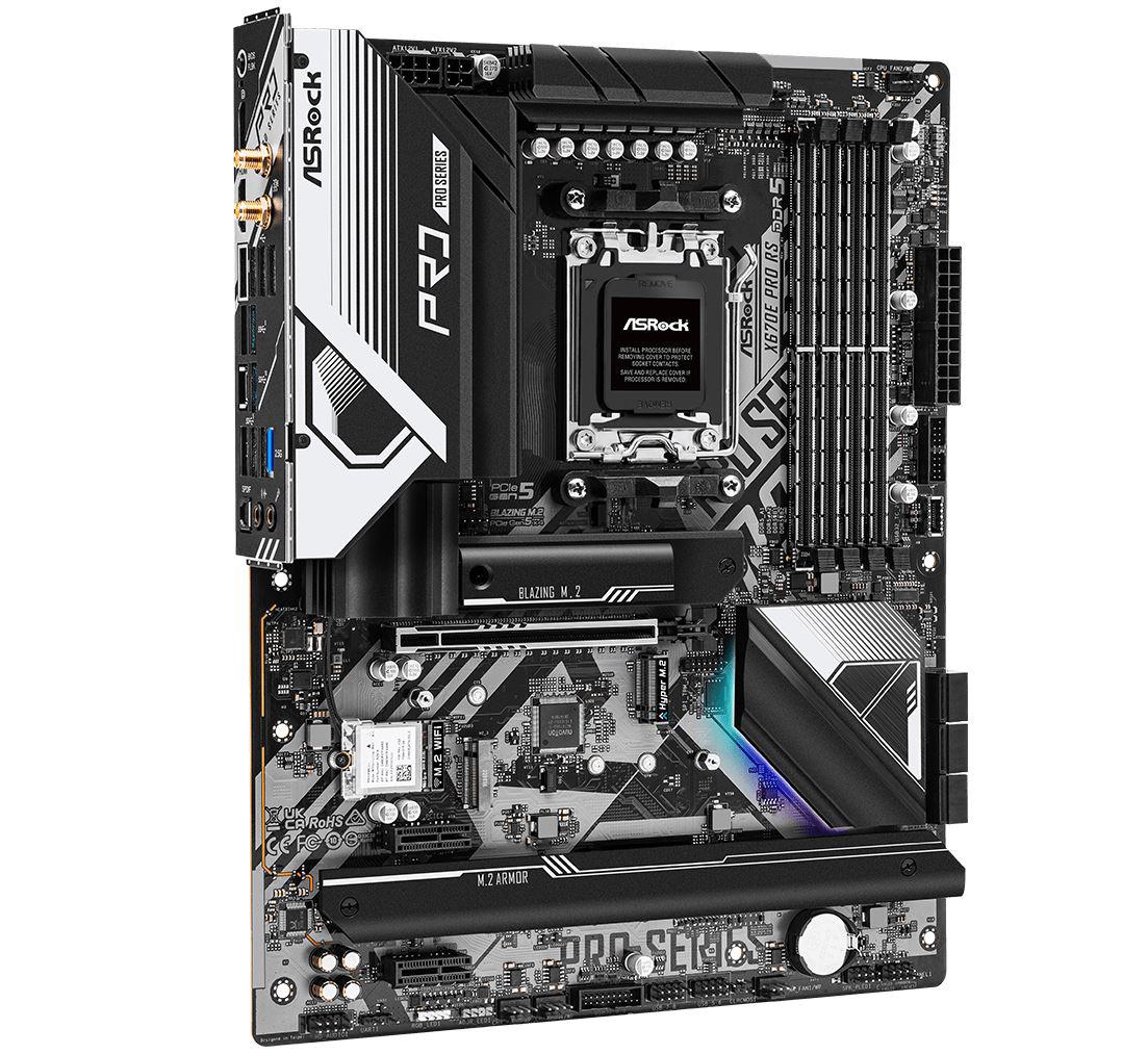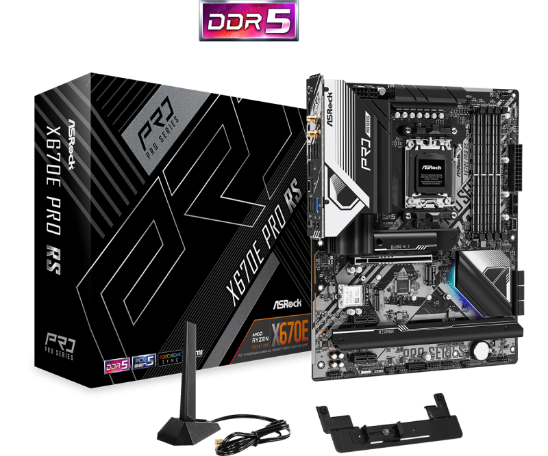 Placa de baza AsRock Socket AM5, X670E Pro RS Supports AMD Ryzen™ 7000 Series Processors 14+2+1 Phase Power Design, SPS 4 x DDR5 DIMMs, supports up to 6600+(OC) 1 PCIe 5.0 x16, 2 PCIe 4.0 x1, 1 M.2 Key-E for WiFi Graphics Output Options: 1 HDMI, 1 DisplayPort 7.1 CH HD Audio (Realtek ALC897 Audio Codec), Nahimic Audio 1 Blazing M.2 (PCIe Gen5x4), 3 Hyper M.2 (PCIe Gen4x4), 1 M.2 (PCIe Gen3x2 & SATA3), 6 SATA3 1 USB 3.2 Gen2x2 Type-C (Front), 1 USB 3.2 Gen2 Type-C (Rear), 1 USB 3.2 Gen2 Type-A (Rear), 8 USB 3.2 Gen1 (4 Rear, 4 Front), 8 USB 2.0 (4 Rear, 4 Front) Realtek 2.5G LAN 802.11ax Wi-Fi 6E + Bluetooth802.11ax Wi-Fi 6E + Bluetooth