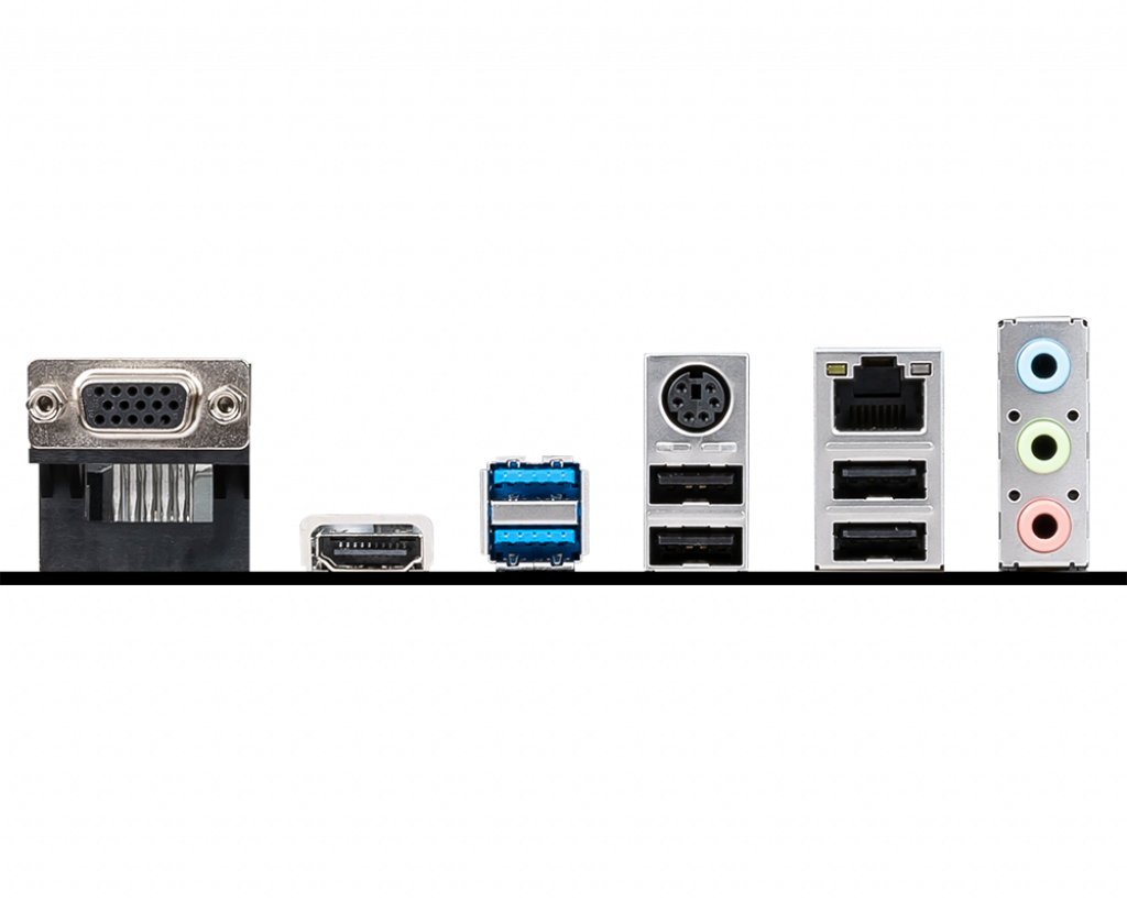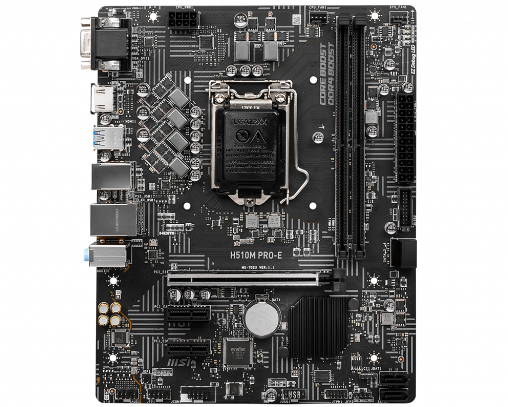 Placa de baza MSI H510M PRO-E LGA 1200 SPECIFICATIONS Model Name H510M PRO-E CPU Support Supports 10th Gen Intel® Core™ Processors, 11th Gen Intel® Core™ Processors, Pentium® Gold and Celeron® Processors CPU Socket LGA 1200 socket Chipset Intel® H510 Chipset Graphics Interface 1x PCIe 4.0 x16 slot Display Interface Support 4K@30Hz as specified in HDMI 1.4, VGA – Requires Processor Graphics Memory Support 2 DIMMs, Dual Channel DDR4-3200MHz (MAX) Expansion Slots 2x PCIe 3.0 x1 slots Storage 4x SATA 6Gbps ports USB ports 4x USB 3.2 Gen 1 5Gbps (4 Type-A) 6x USB 2.0 LAN Realtek® RTL8111 Gigabit LAN Audio 8-Channel (7.1) HD Audio with Audio Boost https://www.msi.com/Motherboard/H510M-PRO-E