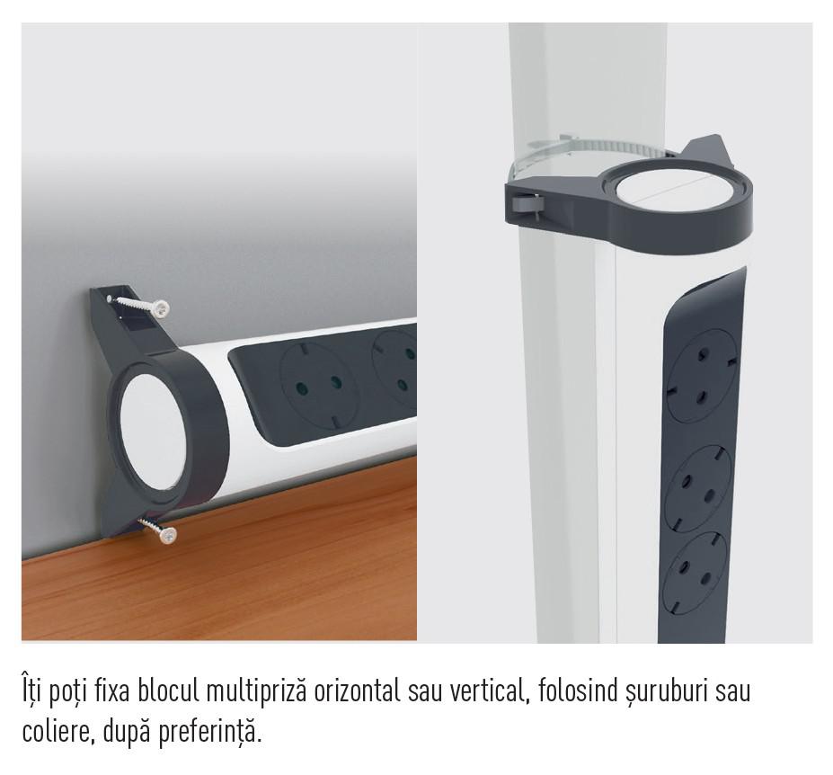 - posibilitate de fixare a blocului multipriza orizontal sau vertical, folosind suruburi sau coliere, dupa preferinta (neincluse in pachet);
