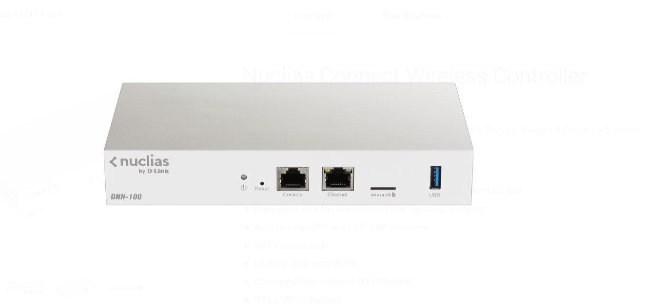 D-link Nucillas wireless controller DNH-100, Manages up to 100 Wireless Access Points (APs), 1 x 1000 Base-T Ethernet Port, 1 x USB 3.0 Port, 1 x Micro SD Slot, Pre-loaded with Nuclias Connect Management Software, WPA2/WPA3 Support, IEEE 802.3ab/u/x Support, Single Sign-On, Console Port RJ45, 1x USB port.