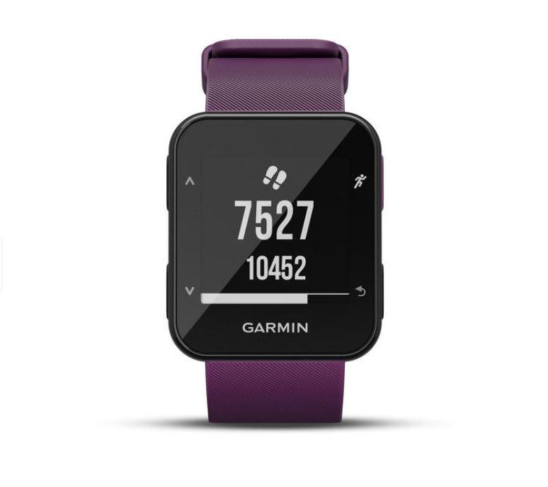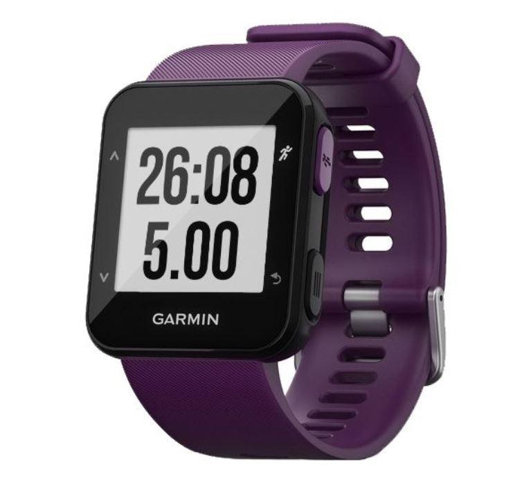 GPS Runnning Watch Garmin Forerunner 30, Ametist, 128 x 128 pixels; sunlight-visible, transflective memory-in-pixel (MIP); glass lens, rechargeable lithium-ion; Smart Mode: Up to 5 days, GPS mode: Up to 8 hours, Water rating: 5 ATM, Garmin Elevate wrist heart rate monitor, Interval training, Calories burned, Time/distance alerts (triggers alarm when you reach goal)GPS-based distance, time and pace