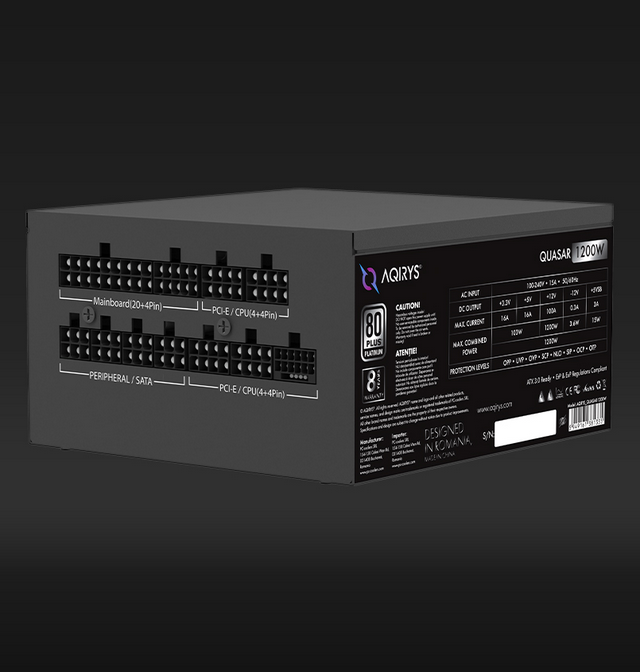 Sursa Aqirys Quasar 1200W 80 Platinum Plus TECHNICAL DATA Continuous power: 1200W Form factor: ATX ATX Version: ATX V2.52 (3.0 Ready) Efficiency: 80PLUS® Platinum certified Intel® C6/C7: Yes PFC: Active Illumination: No Modular cables: Yes Cable type: Flat, black Fan size: 120 mm Fan speed: Temperature controlled Fan technology: Hydro Dynamic Bearing AC Input: 200 – 240V, 15A, 50/60Hz DC Output +3.3V: 16A DC Output +5V: 16A DC Output +12V1: 100A DC Output -12V: 0.3A DC Output +5Vsb: 3A MB connector: 1x 20+4P CPU connector: 2x 4+4P PCIe connector: 2x (2x 6+2P) PCIe (Gen 5.0) connector: 1x 12+4P SATA connector: 9x Molex connector: 3x 4P Protections: OOP, UVP, OVP, SCP, NLO, SIP, OCP, OTP Environmental compliance: RoHS, WEEE, ErP Lot 6 Dimensions (LxWxH): 160 x 150 x 86 mm Weight: 1450 g