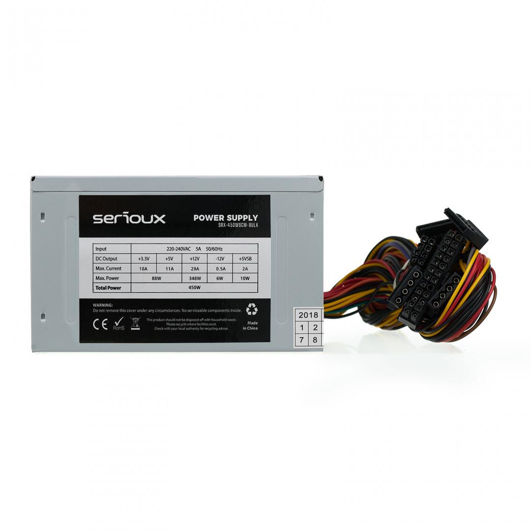Sursa Serioux 450W, Ventilator 8cm, Protecții: OCP/OVP/UVP/SCP/OPP, Cabluri: 1*20+4pin, 1*4+4pin, 2*Molex, 2*SATA, Cablu alimentare: 1.2m, bulk