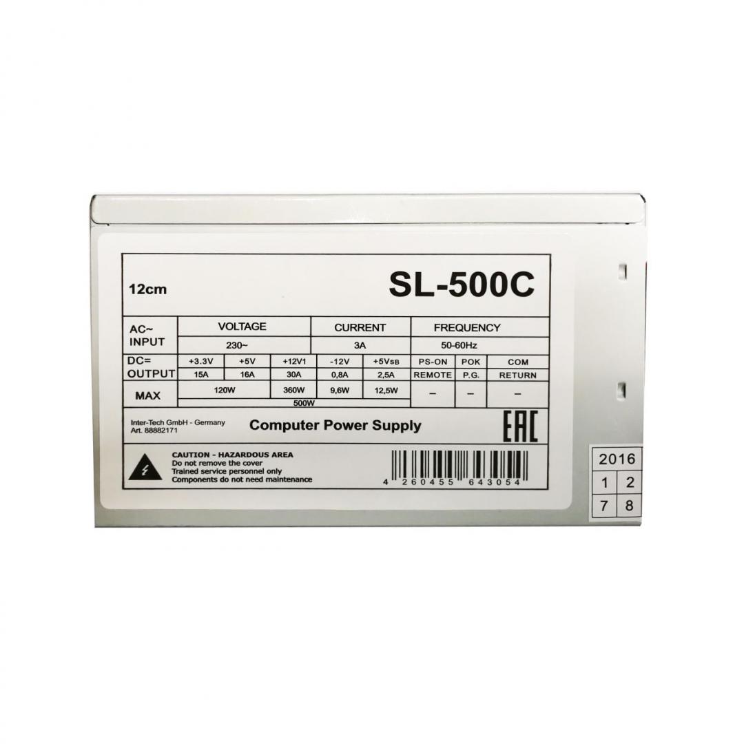 Sursa Inter-Tech SL-500C 500W ventilator 120mm, single rail (30A), ventilator silentios de 120mm, 2x SATA, 2x Molex, 1x Floppy, 1xEPS 4pin(350mm), 1x 24pin, SCP/OCP/OVP, Passive PFC, bulk + cablu de curent
