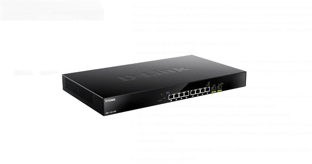 D-Link switch DMS-1100-10TP, 10 porturi,2 X SFP, POE 8 porturi, Auto MDI/MDIX, 80 Gbps, Forwarding Rate: 59.52 Mpps, dimensiuni: 440 x 250 x 44 mm, greutate: 3.43kg, Maximum PoE Budget: 240W.