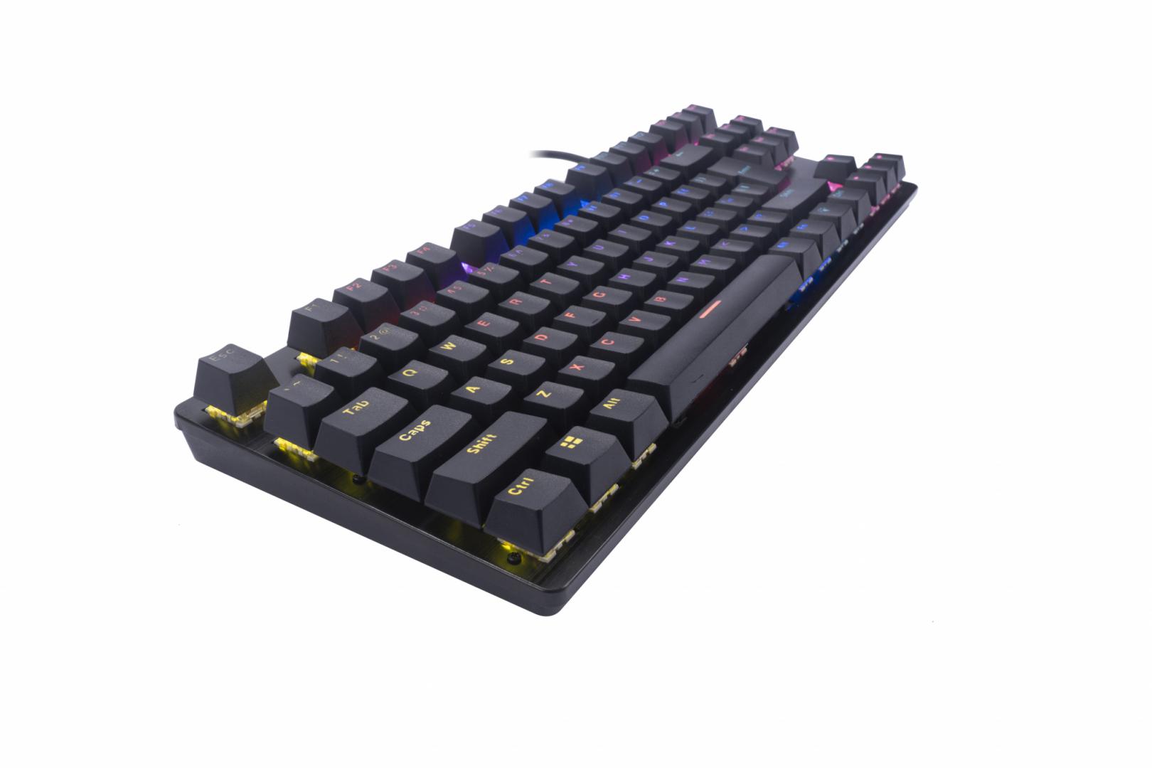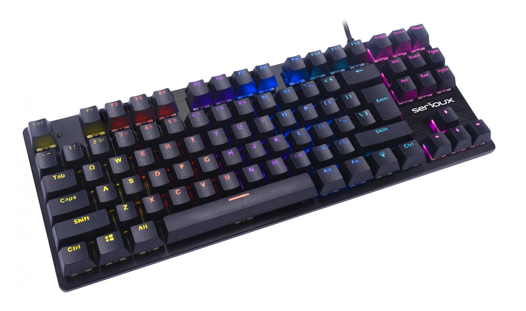 Tastatura gaming mecanica Serioux Freya, switch OUTEMU blue, pana la 50 milioane click-uri, 87 taste, 26 taste Anti-ghosting , 9 moduri de iluminare rainbow, material: ABS, layout US, palm rest de piele detasabil, forta actionare: 60g ± 10g, plug and play , greutate: 780g ± 20g, cablu USB 1.5M PVC, compatibila cu Windows 2000/XP/9X/VISTA/7/8/10
