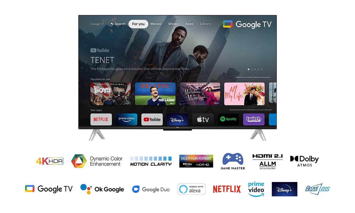 TV TCL, 43P638, 2022, 43″-108CM, LED, Smart TV, 4K, Black, Flat, Google TV, Mirroring iOS, Android, AiPQ 2.0 Engine, HDR10+/HLG/Dolby Vision IQ, Dolby AC-4, Dolby Atmos, Dolby TrueHD, 50/60Hz+FRC, DVB-T2/C/S2, 2, 2 x 10W, Subwoofer integrat: Nu, Wi-Fi, Bluetooth, 1 x Jack 3.5 mm, 1 x USB 3.0, 1 x RJ-45, CI+ slot, 3 x HDMI 2.1, 1 x Digital Optical Out, 1 x HDPC 2.3, 200 x 200, Standard Remote, QWERTY Remote, 2 AAA batteries, Power cable, Table support